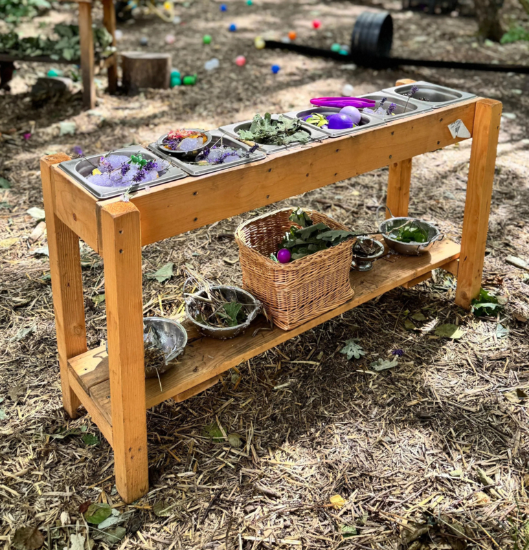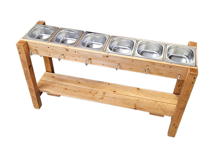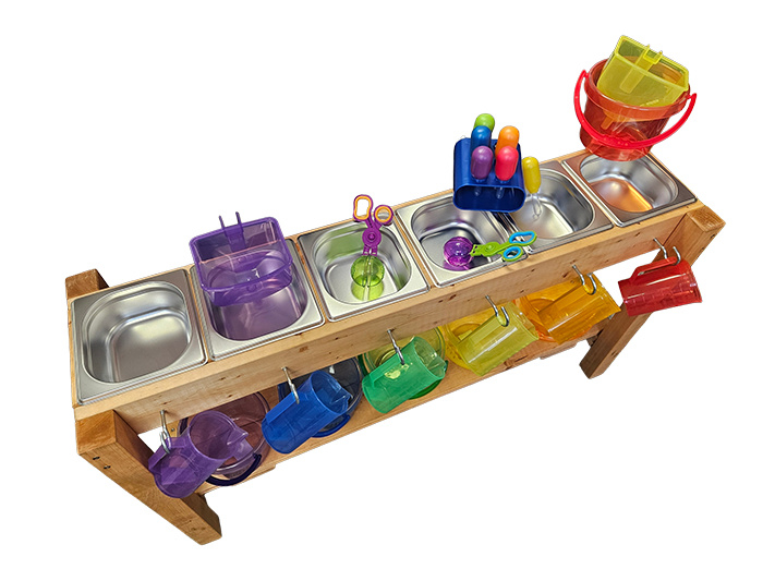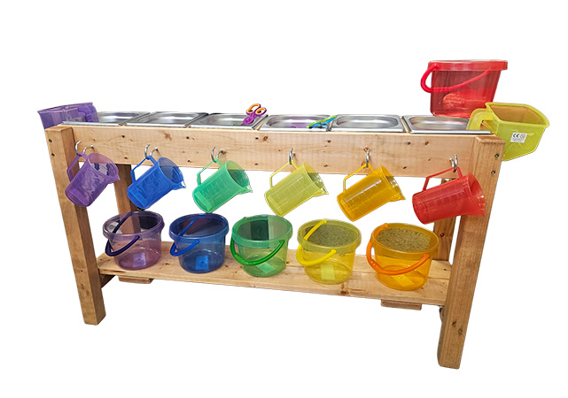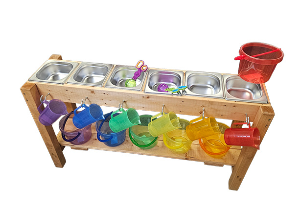 Deze werkbank heeft 6 metalen bakken die je kan vullen met water, zand, slijm, scheerschuim, bloemetjes, rijst, macaroni, pompoms... verzin het maar!