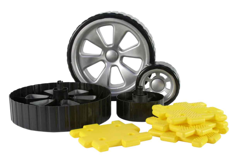 De set bestaat uit 2 grote en 2 kleine wielen en 4 dichte vierkanten om ze in te klikken.